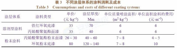 表3列出了在涂層厚度滿足技術(shù)要求的基礎(chǔ)上按理論計算的每平米施工費用。
