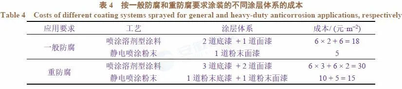 要達(dá)到相同的防腐效果,溶劑型涂料與粉末靜電噴涂的道數(shù)及成本如表4所示。可見采用粉末靜電噴涂的生產(chǎn)成本明顯少于溶劑型涂料噴涂。